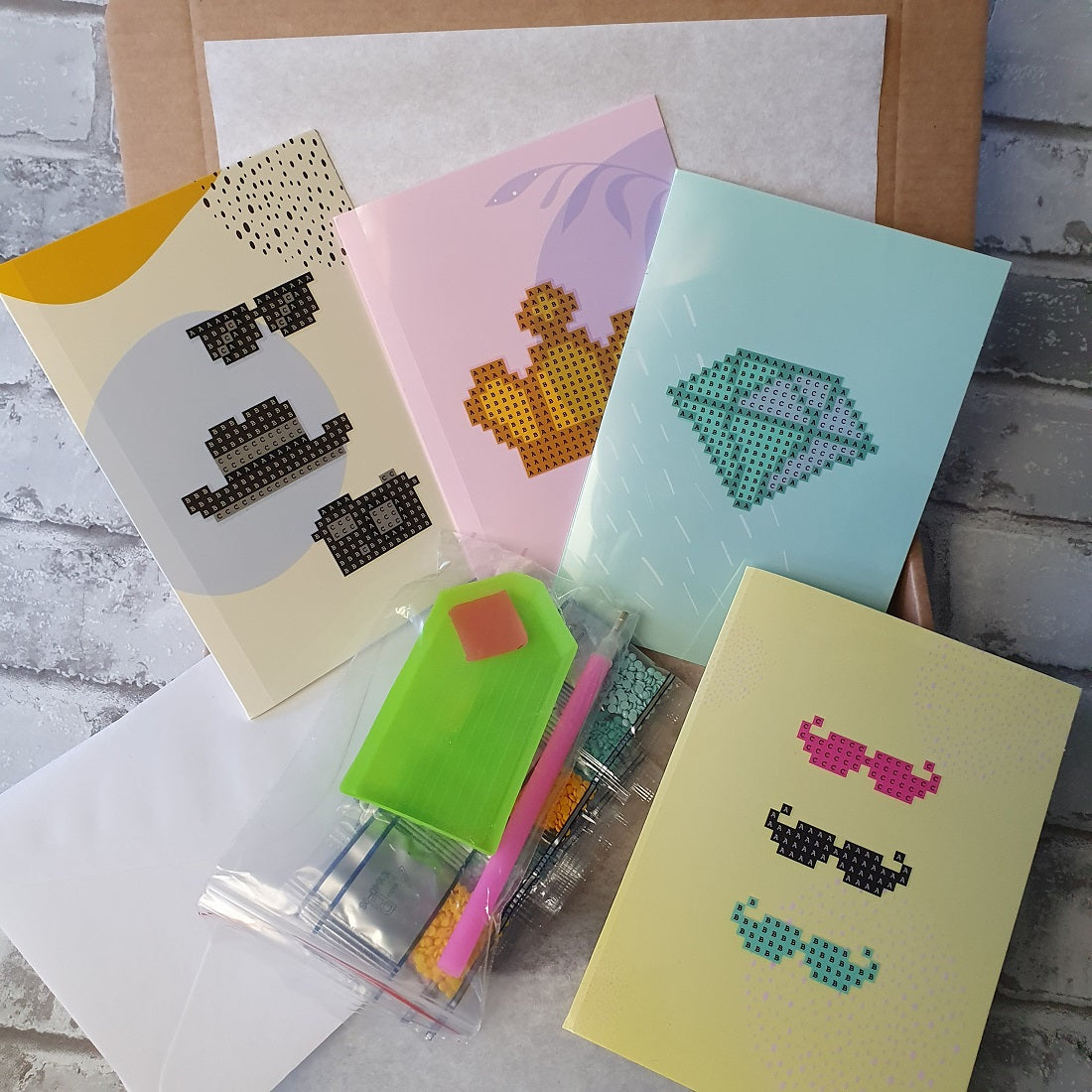 Laat je kaarten schitteren met deze opvallende Diamond Painting Kaarten met coole en glamoureuze ontwerpen! Versier unieke afbeeldingen zoals een kroon, diamant en snor met fonkelende ronde steentjes voor een opvallend eindresultaat.