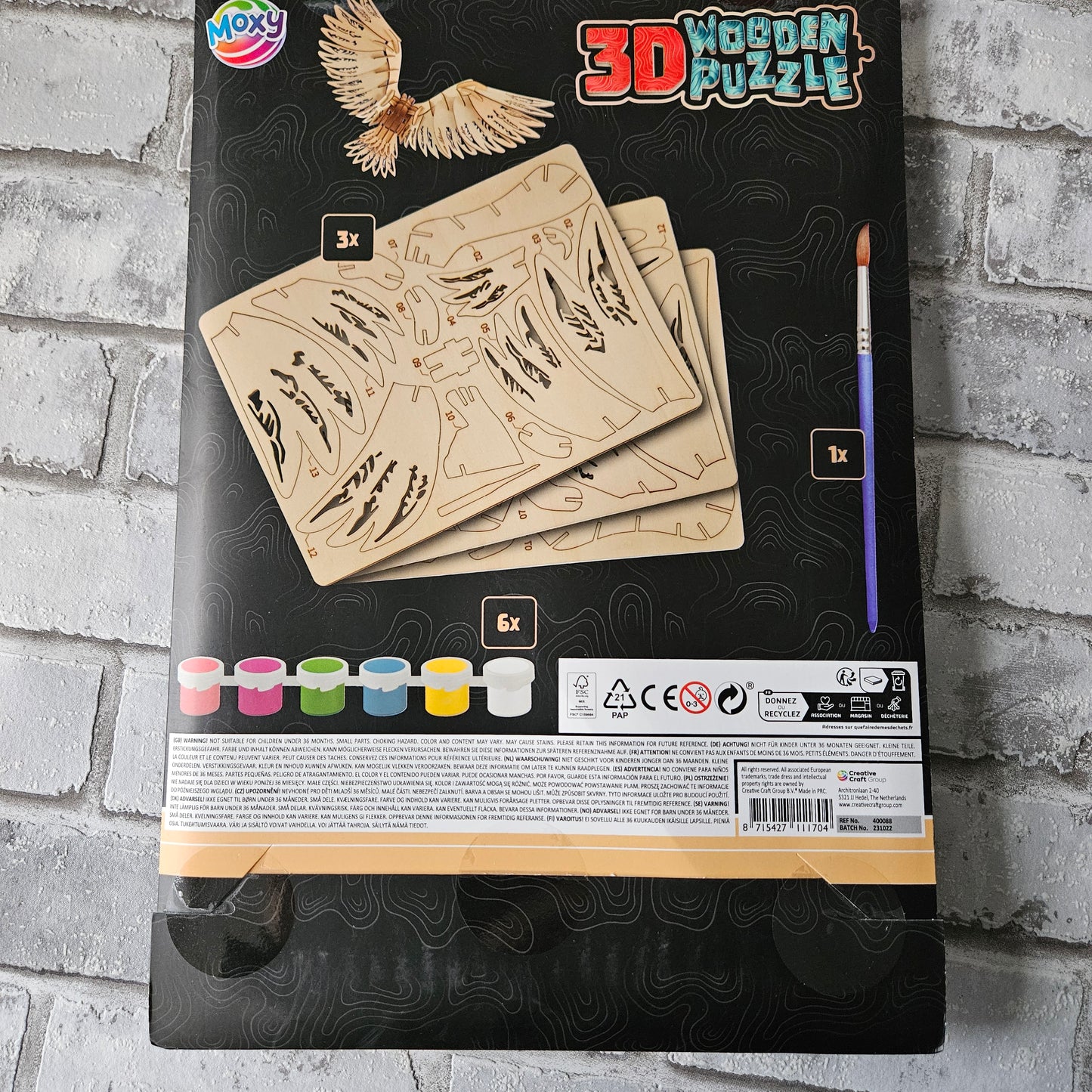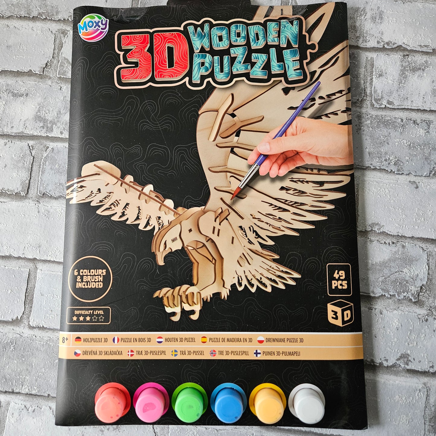 Beleef het avontuur van bouwen en kleuren met deze indrukwekkende houten 3D puzzel van een roofvogel! Deze middelgrote puzzel bestaat uit maar liefst 49 stukken en biedt een uitdagende en creatieve ervaring. Zodra de roofvogel in elkaar zit, kun je hem volledig naar eigen smaak beschilderen met de 6 kleuren verf en het meegeleverde kwastje.